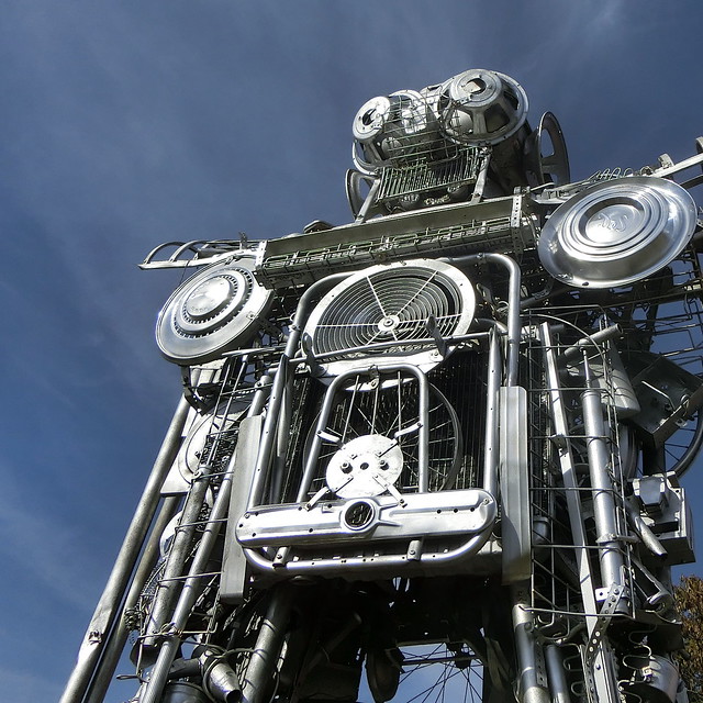 In 10 years of work Mike Goggans has built his Junkosaurus Wrecks from all kinds of scrap metal. Washing machine parts, screws, scrap metal, belt buckles - everything metallic was processed into this 6-meter high prehistoric behemoth. On the roadside, however, the future stands in the form of a scrap robot with the name "Lirpa Anad Nitsud" which is probably the names of the artist's children read backwards.
