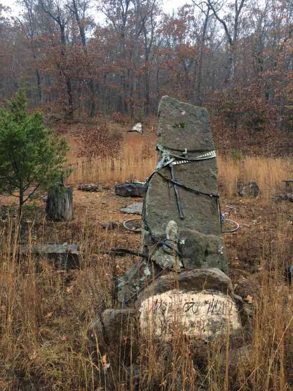 Then there is a bicycle frame with a shovel, rims, and large cement chunks with pieces of metal and wood sticking out of them. All parts of installations that the weather has destroyed over the years